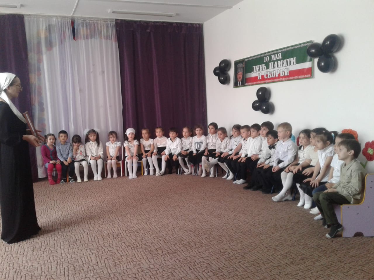 В старших и подготовительных группах провели тематические беседы на тему: «10 мая -День памяти и скорби чеченского народа» По всей республике в эти дни прошли религиозные обряды- читали Мовлид и совершали зикр. В этот день вспоминают тех, кто отдал свою жизнь за наши надежды и мечты. Мирное небо хранит подвиги и имена героев, которые навечно вписаны в историю Чеченской Республики. В нашем ДОУ провели тематические беседы посвященные Дню памяти о Первом Президенте Герое России А.-Х. Кадырове, где говорилось о том, как он пожертвовал своей жизнью, ради процветания и возрождения Чеченской Республики. Жизнь первого президента, отданная во имя свободы, принесла мир и спокойствия на чеченскую землю. Он всегда был, есть и будет Народным Героем России. Его поступки навечно останутся в сердцах народа. Фасад здания был оформлен баннером, также в группах были вывешены стенды и газеты, посвященные Первому Президенту А.-Х. Кадырову.